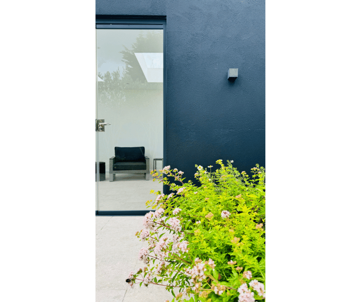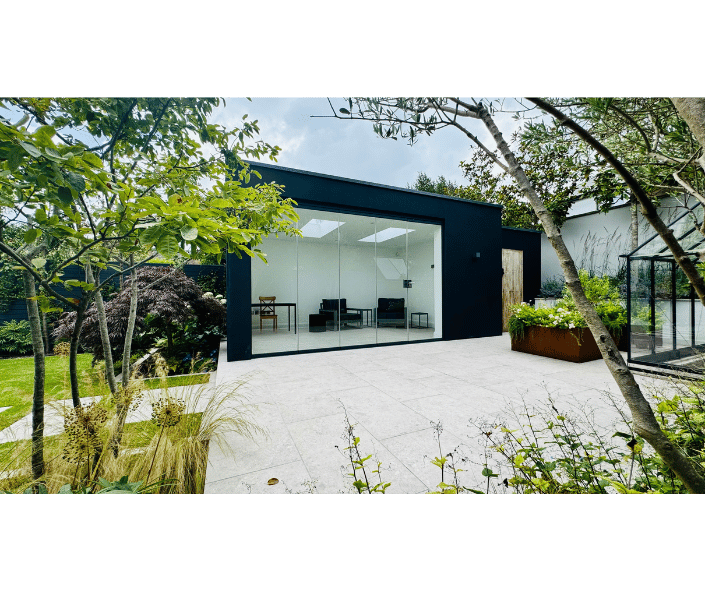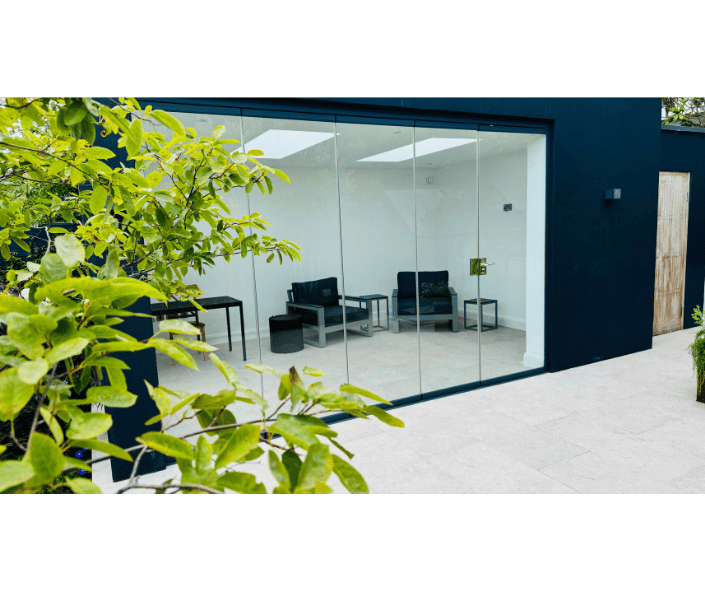 - The garden room is neatly finished with sand/cement render on the outside and a skim finish on the inside. We also added a green sedum roof for additional biodiversity. The glass window is bespoke with a chosen powder coated finish and the doors come from Spain and are frameless bifold doors which pivot on the upper track.
