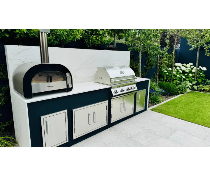 - The outdoor kitchen carcass is made entirely by us on site and we outsource the counter work to keep it as high end as possible with all corners mitered.